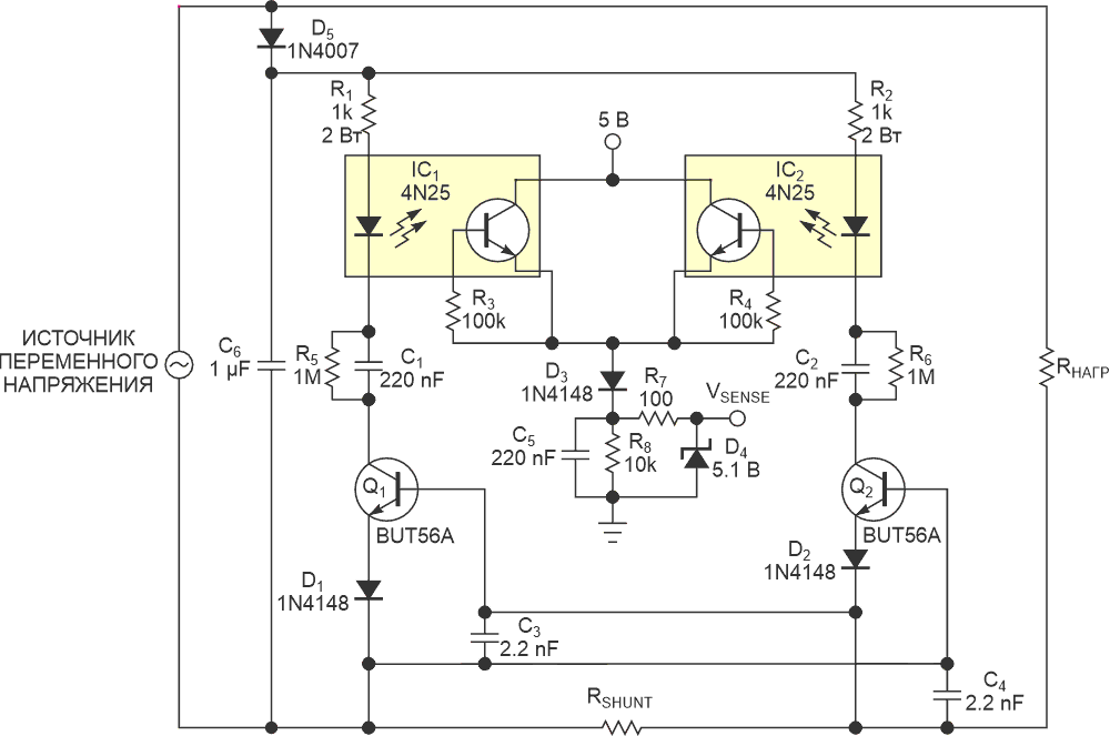 Оптически изолированный детектор перегрузки по току работает от сети переменного тока
