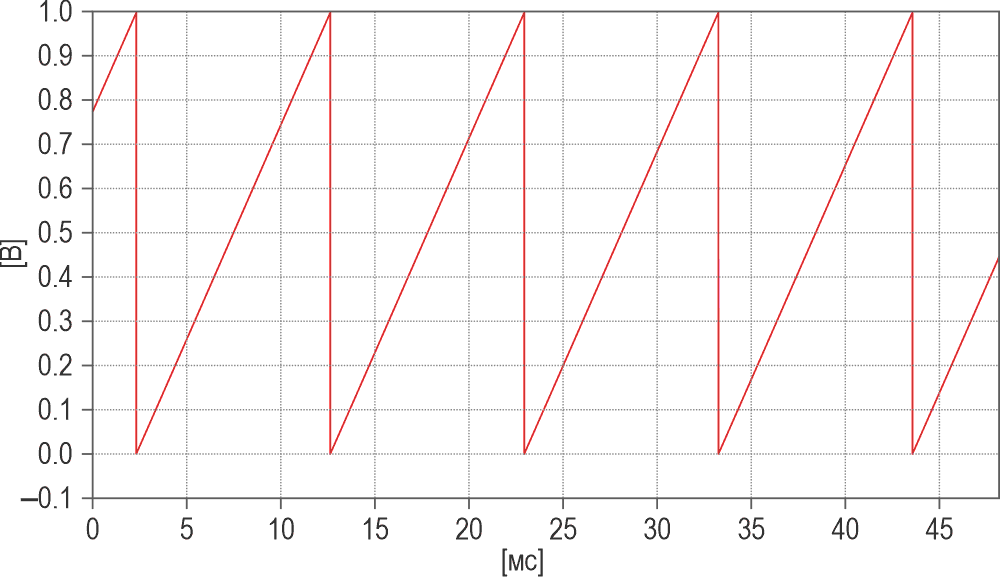 | Рисунок 2. | Пилообразные импульсы частотой 10 Гц при R6 = 12 МОм. |