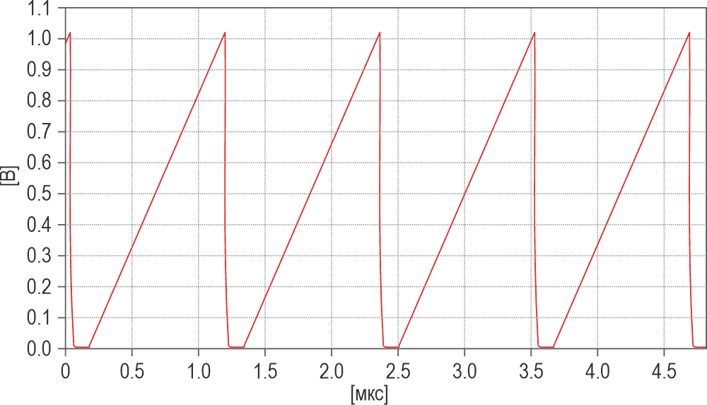 Операционный усилитель U1 буферизует этот сигнал и передает его на вход компаратора U2A. Когда уровень пилообразного сигнала достигает порога 1 В, установленного делителем напряжения на другом входе компаратора, компаратор переключается, и уровень его выходного сигнала становится низким. Цепь на элементах U2A, R1, Q1, R8, C1 и U2B формирует на выходе U2B импульс длительностью 100 нс, который открывает транзистор M1, чтобы быстро разрядить конденсатор C3 на землю.